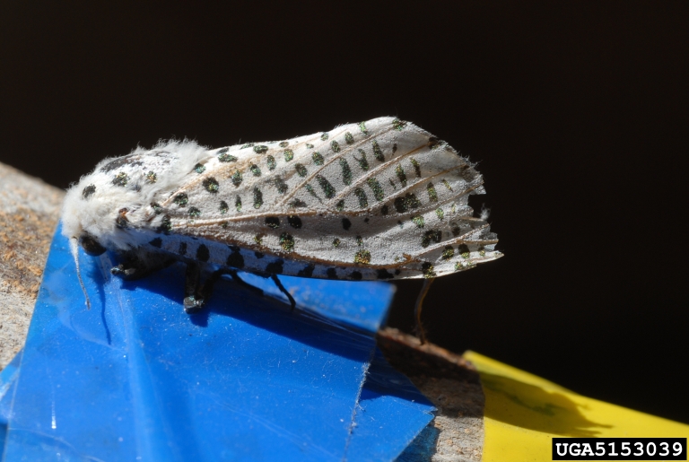 حشره بالغ (پروانه) رنگ بدن سفید متمایل به کرم؛ یک نوار طلایی روی انتهای شکم در پروانه ماده، عرض بالها حدود ۳۵ تا ۴۰ میلیمتر