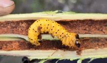 لارو (کرم آفت) رنگ قهوهای مایل به خاکستری با موهای بلند، دارای لکههای نارنجی روی پشت، طول آن در مرحله نهایی رشد حدود ۳۰ تا ۳۵ میلیمتر